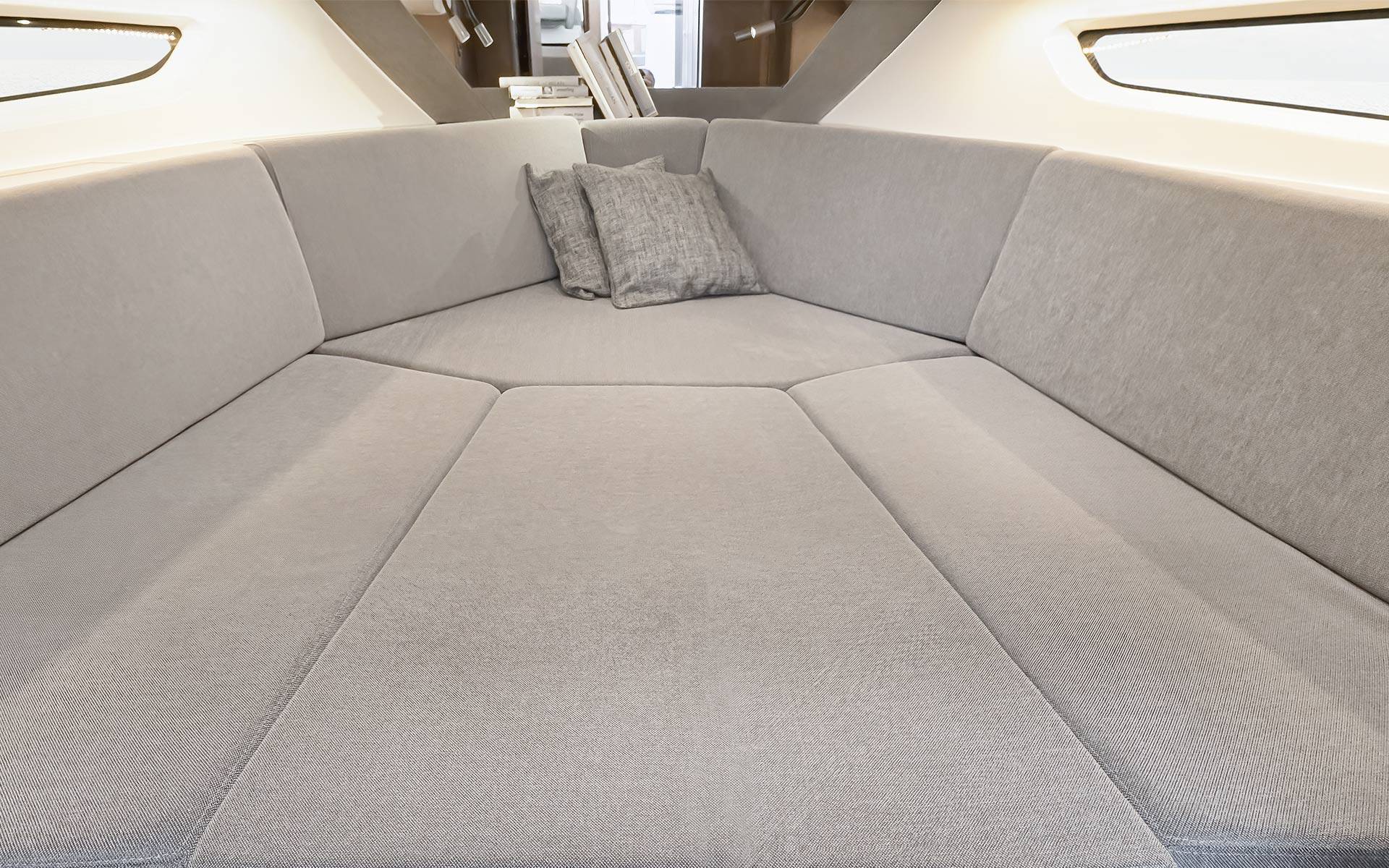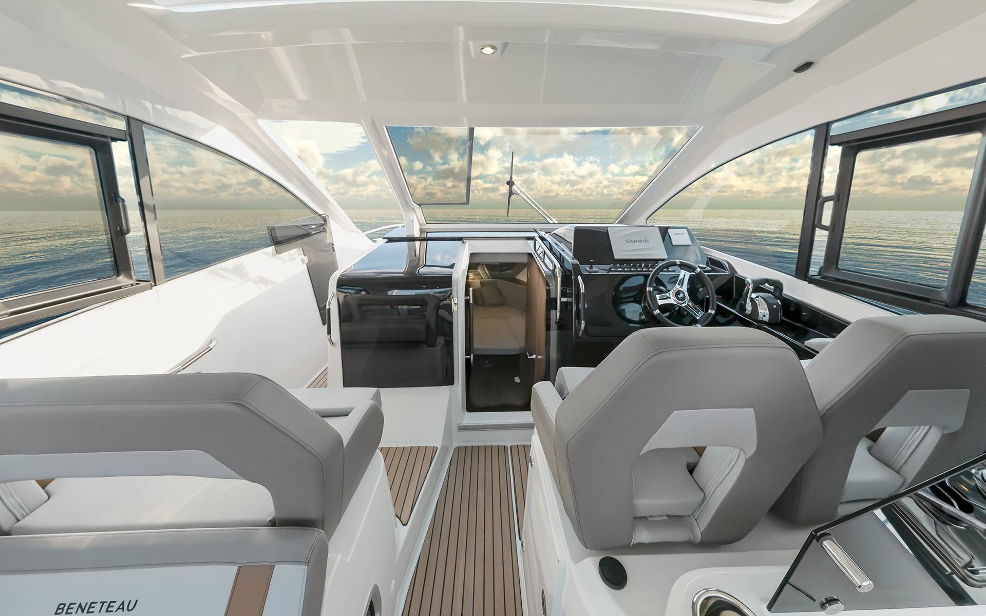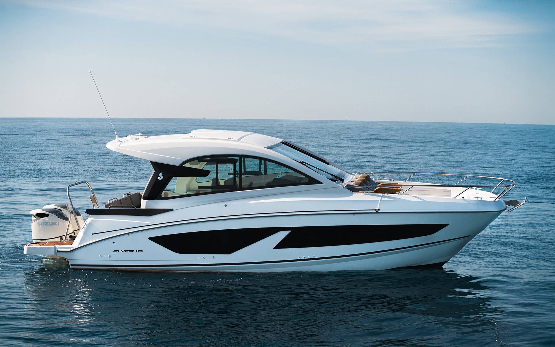 Exterior Design: With its cutting-edge design, the Flyer 10 Sport Top is the perfect embodiment of the Flyer range. The elegant shape of its frames plays with light and reinforces its contemporary look. On the upper deck, the seamless layout of space creates a harmonious atmosphere. Thanks to its generous headroom, this model provides a feeling of constant openness, in keeping with the Open boat spirit.