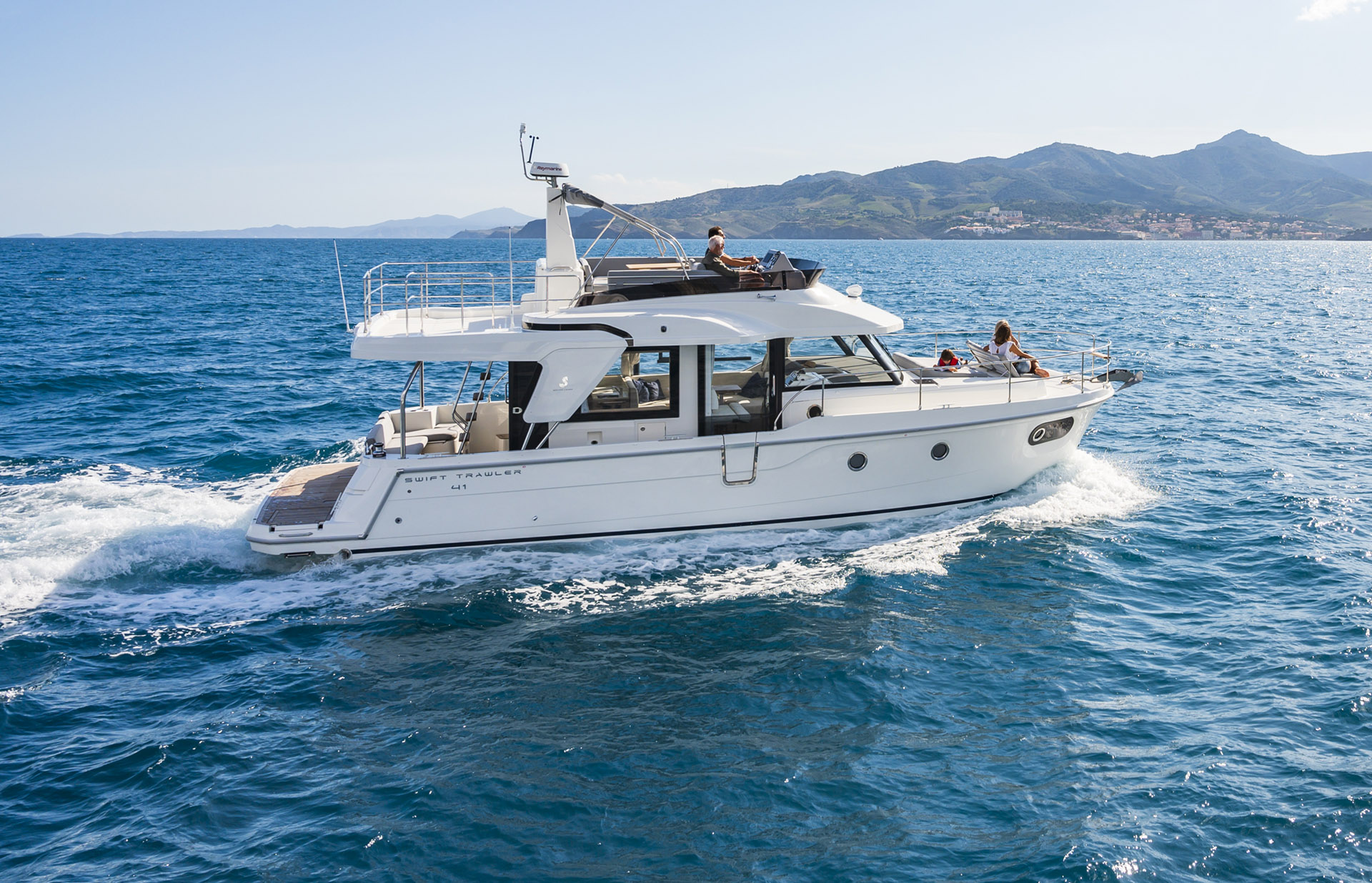 A generous passagemaker, the Swift Trawler 41 successfully renews the spirit and style of the trawler range. Comfortable, practical, and boasting ample living space, this new, innovative 40-foot powerboat, available in both Fly and Sedan versions, has an on-board capacity of up to 7 passengers. Just what to expect from the best trawlers.