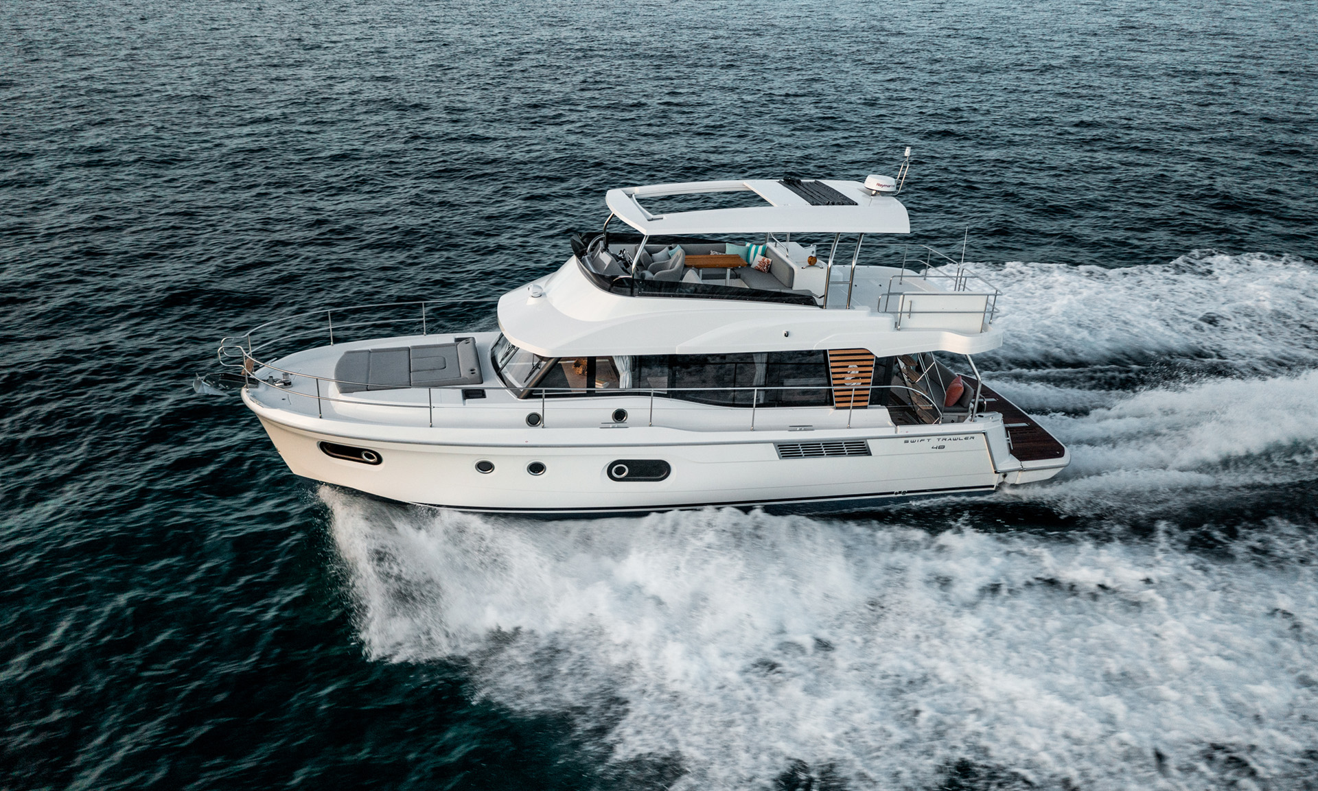 The new Swift Trawler 48 advances the BENETEAU Range of practical and seaworthy passagemakers. The Andreani design focuses on easy living and circulation that builds on the wealth of Beneteau Trawler DNA and customer feedback. The Swift Trawler 48 is 48’4” long overall with a beam of 14’9” and is now positioned as the largest Swift Trawler in the Range only surpassed by the Grand Trawler as the flagship of the BENETEAU trawler range.
