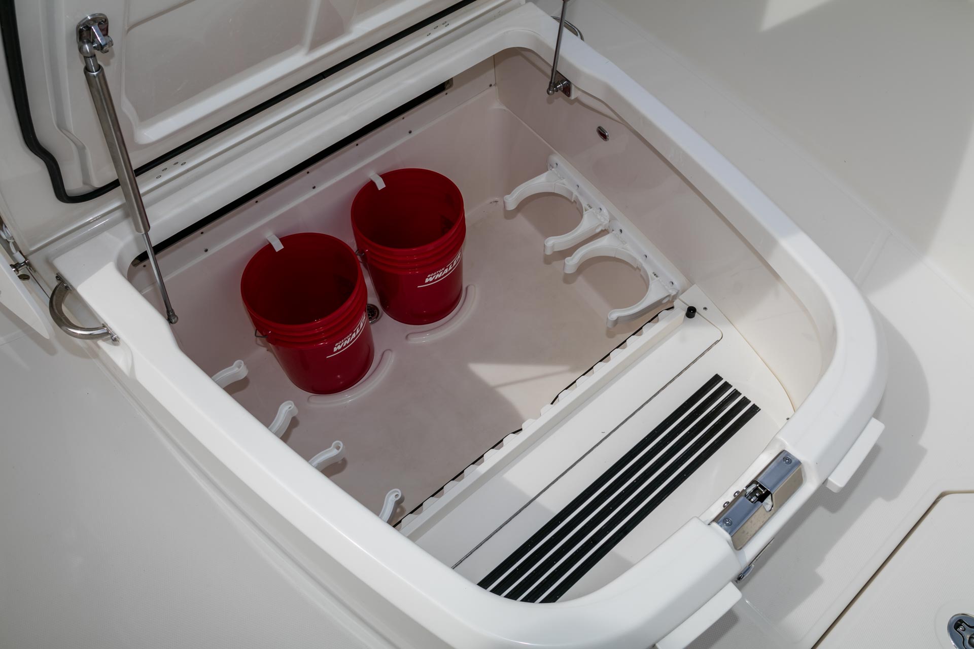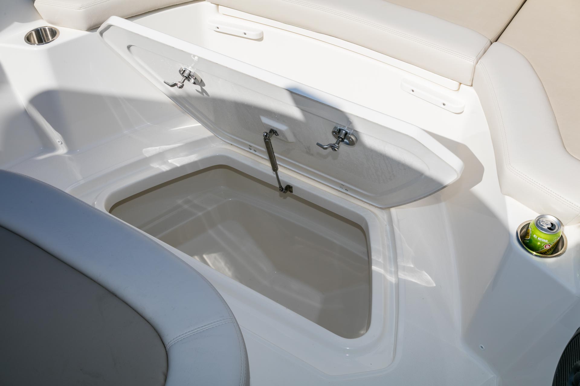 - Plush forward lounge seat with armrests opens to reveal a cavernous storage compartment.