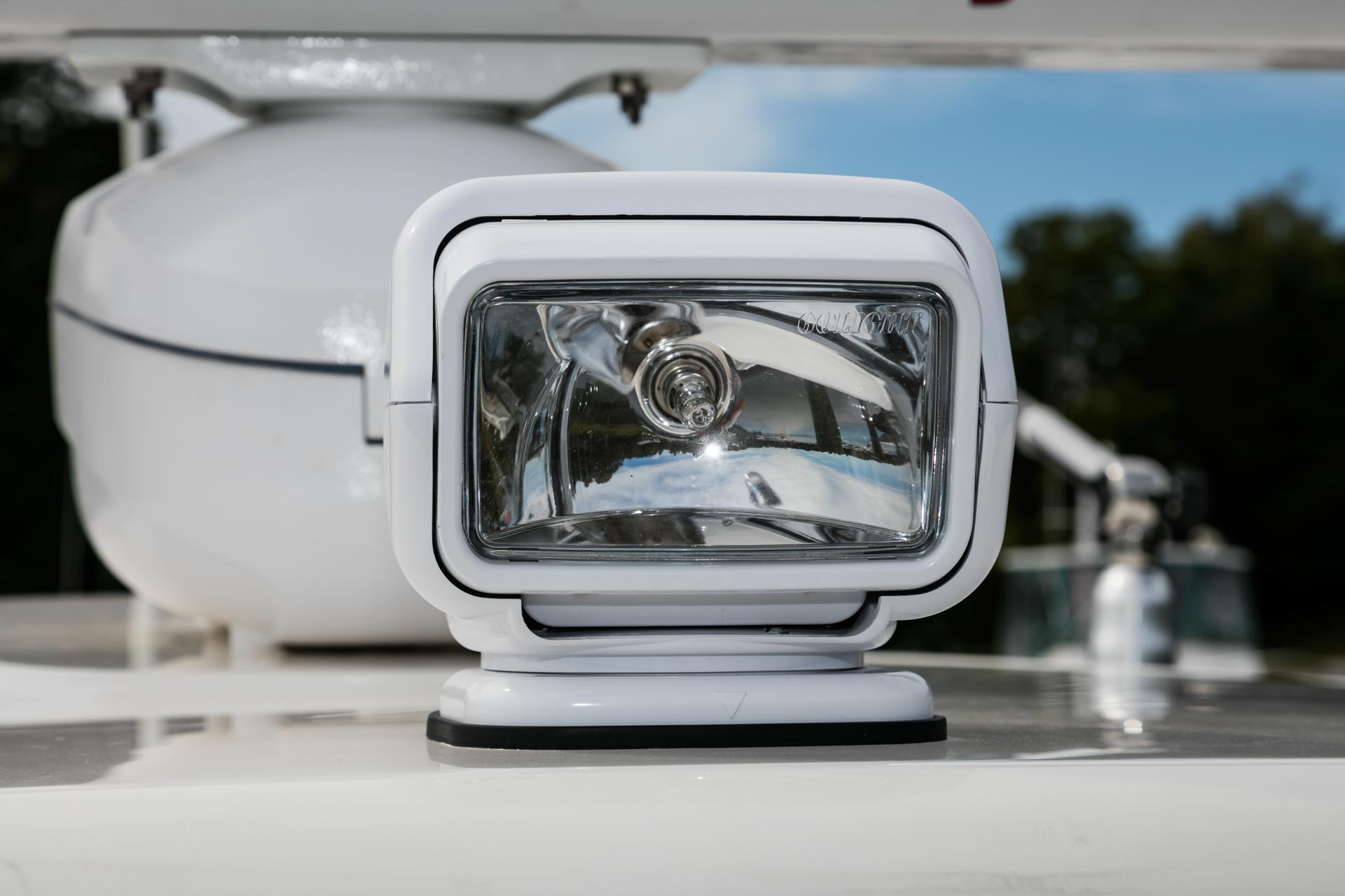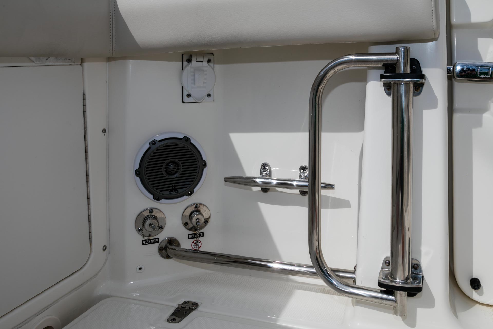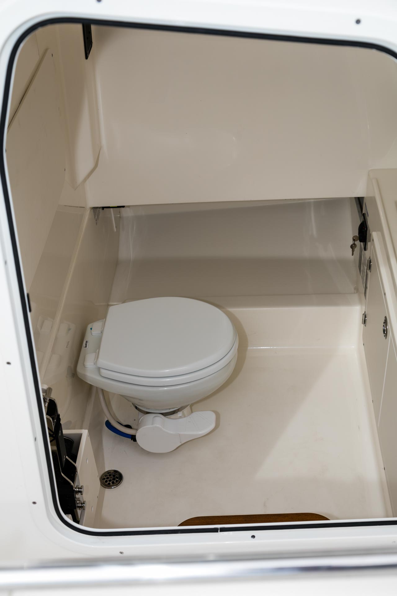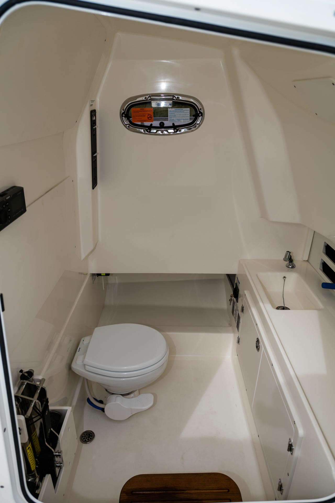 - Private enclosed head compartment in the console features a VacuFlush toilet, porthole and storage space.