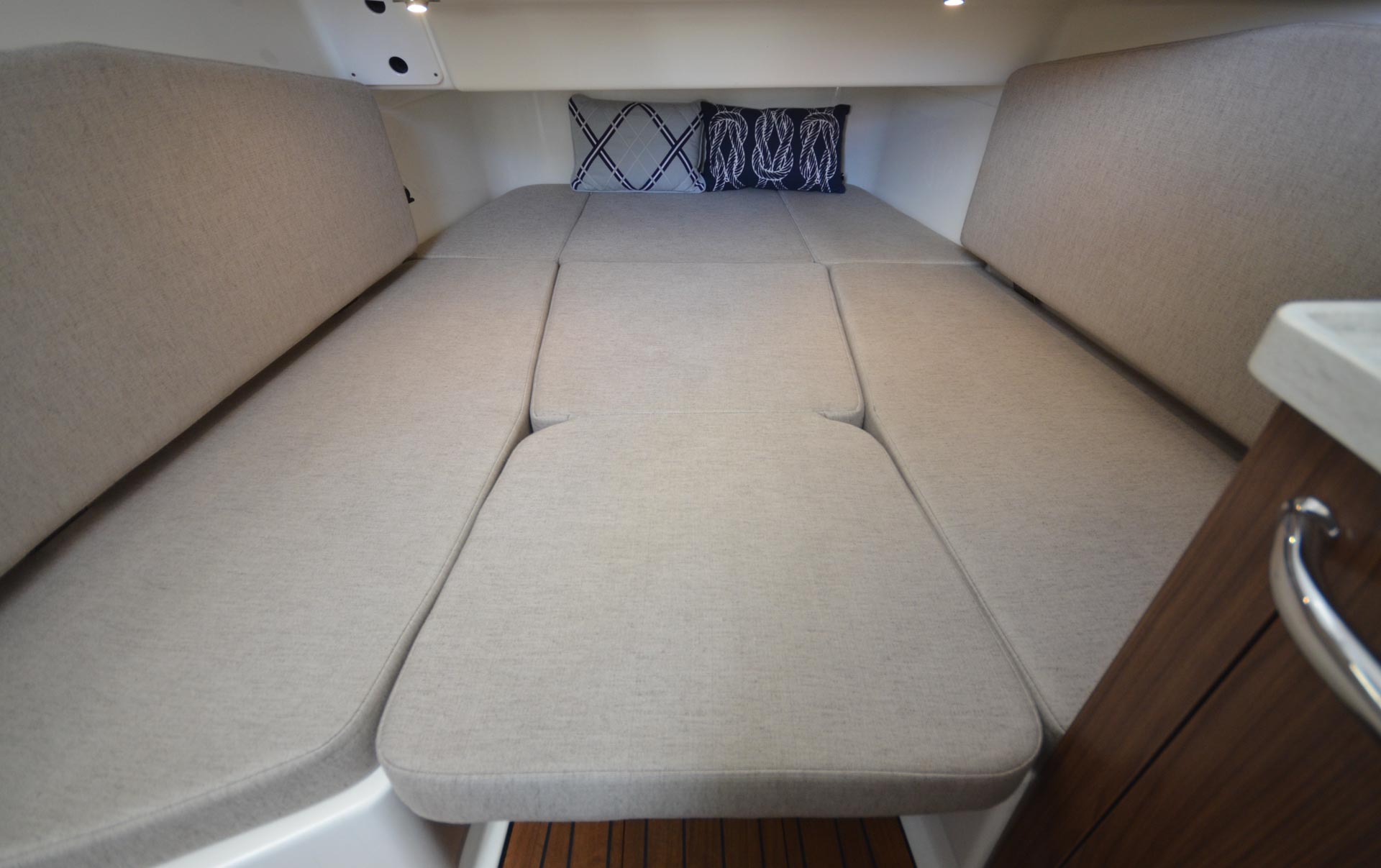 - Air-conditioned helm deck boasts seating for the captain and two companions with bolsters and fold-down arm rests.